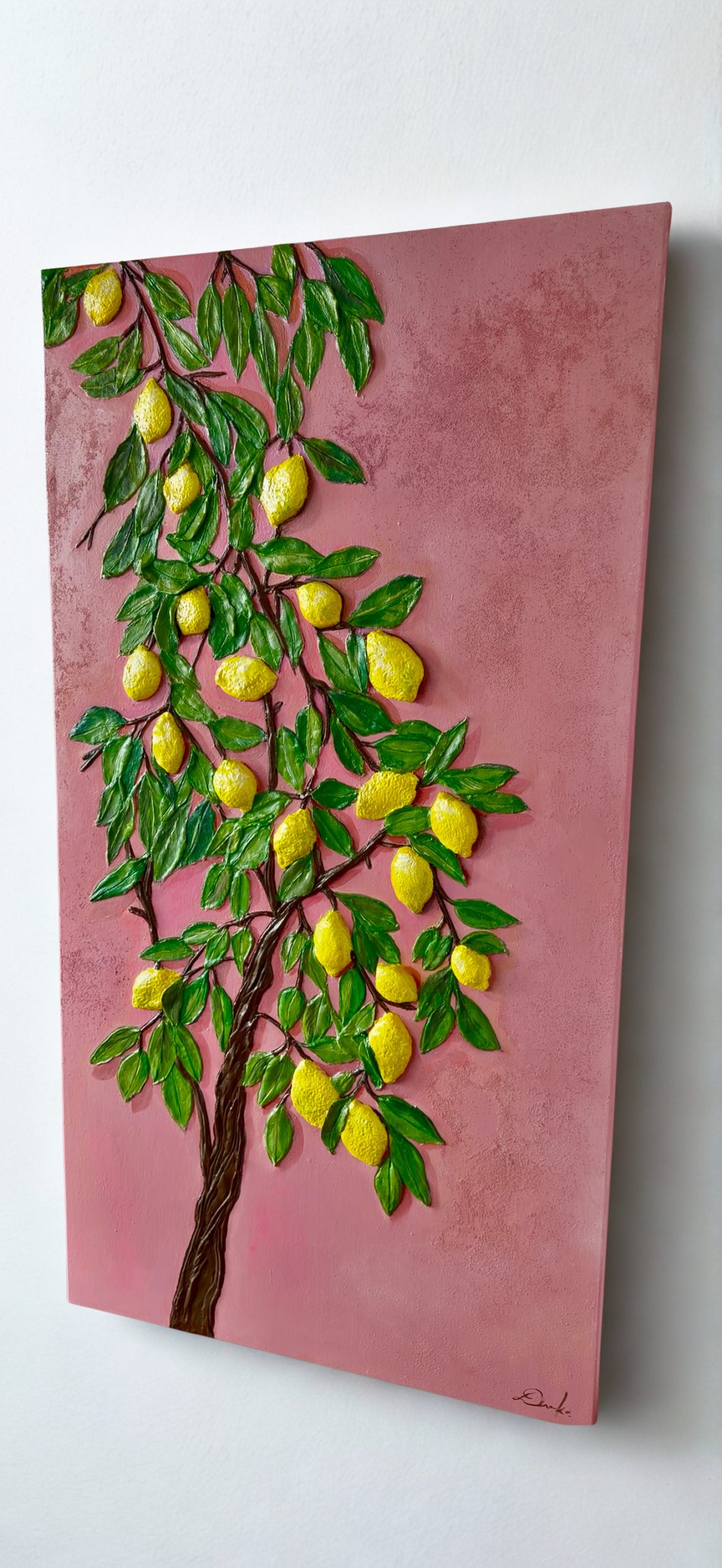 Tento originálny obraz je vytvorený 3D technikou, pri ktorej sú citróny ručne modelované s dôrazom na detail a prirodzenú štruktúru. Každý detail vystupuje z povrchu a vytvára dojem skutočnej hmatateľnosti – akoby ste sa mohli citrónov dotknúť. Vďaka tejto kombinácii techniky a maľby vzniká originálne dielo s výrazným priestorovým efektom, ktorý pôsobí živo a autenticky. Ružové pozadie s jemným pridaním piesku dodáva dielu jedinečnú štruktúru. Vytvára efekt starého múru, ktorý kontrastuje s fresh motívom citrónov a zároveň podčiarkuje ich sviežosť a výraznosť. Tento obraz nie je len dekoráciou, ale zážitkom pre zmysly – spája vizuálnu krásu s takmer reálnym pocitom dotyku.